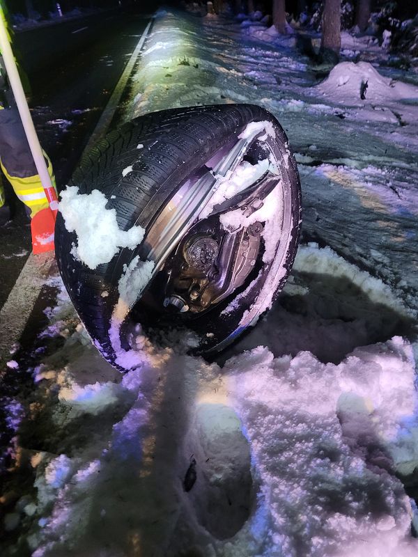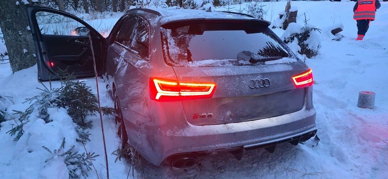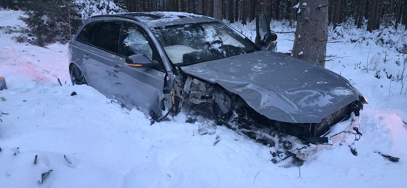 Auf Grund der hohen Geschwindigkeit des Überholenden Audi, raste dieser in den Wald und riss sich dabei die Vorderachse seines Fahrzeuges ab. Wie durch ein Wunder kam es zu keiner Kollision mit den Bäumen, durch die das Fahrzeug seinen Weg nahm.