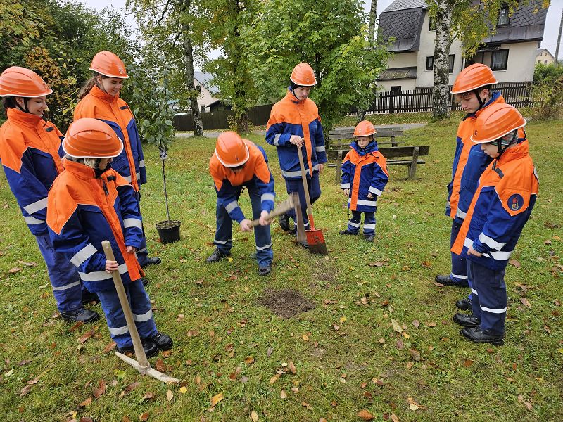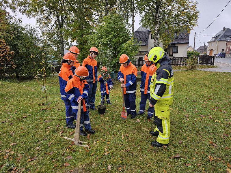 Danach haben wir noch unseren Pflaumenbaum an der Feuerwehr gepflanzt, denn wir waren durch die Jugendfeuerwehr Muldenhammer zur Baumpflanz-Challenge nominiert und das lassen wir uns natürlich nicht nachsagen. Das Ganze haben wir gefilmt und das Video steht auf der Facebook und Instagram Seite der Feuerwehr Grünbach zur Verfügung.