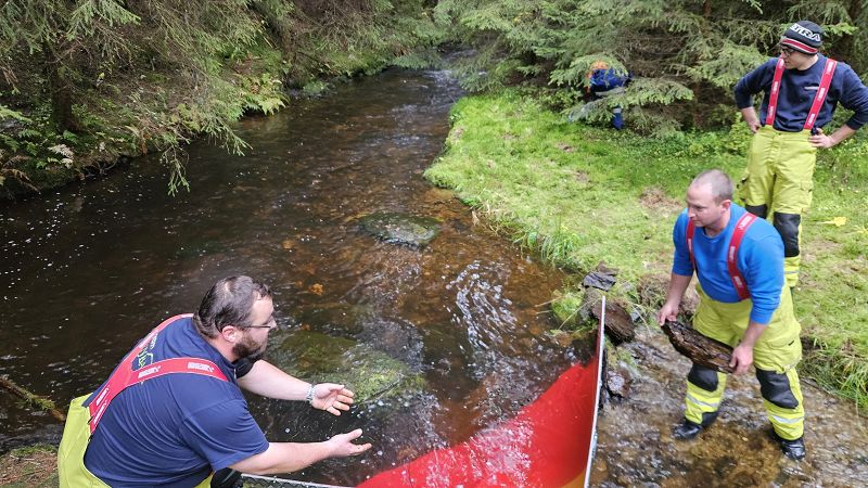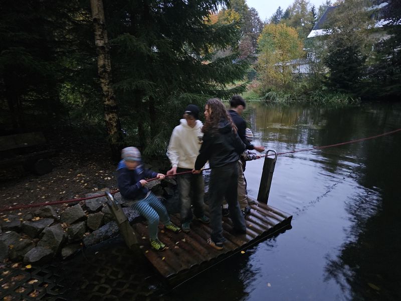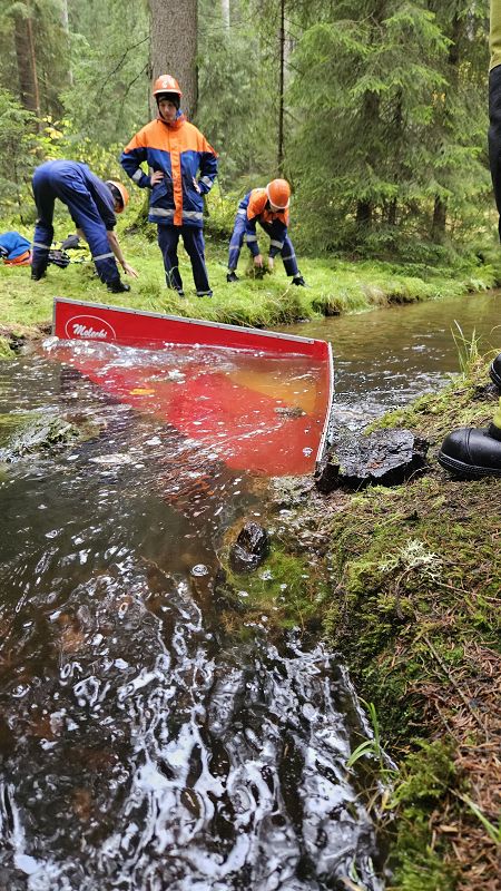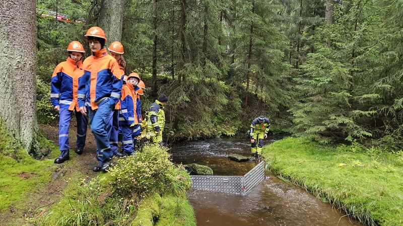 Nach unserer Mittagspause fuhren wir mit den Feuerwehrautos ins Göltzschtal und bauten unseren Biber auf, eine mobile Staustelle. Dieses Gerät ermöglicht es uns, bei niedrigem Bachwasser, immer noch genügend Wasser für eine Löschwasserentnahme anstauen zu können.