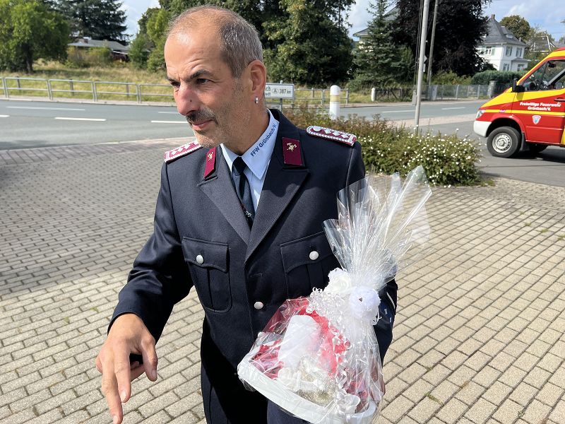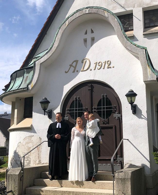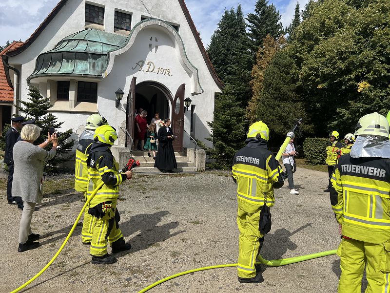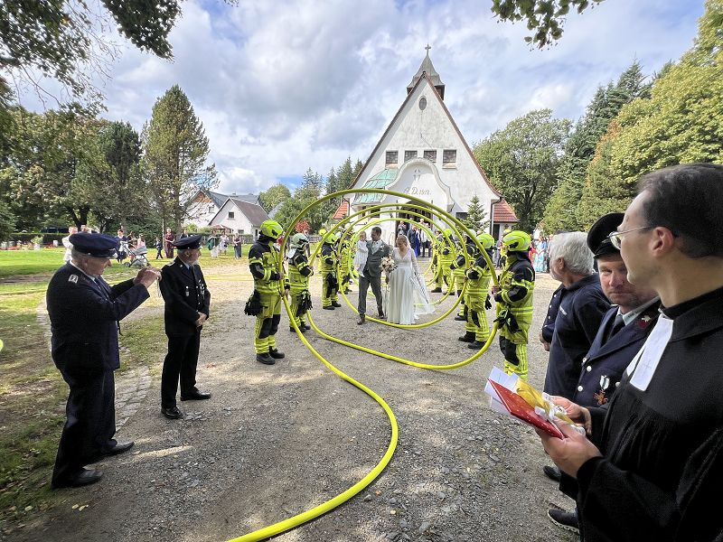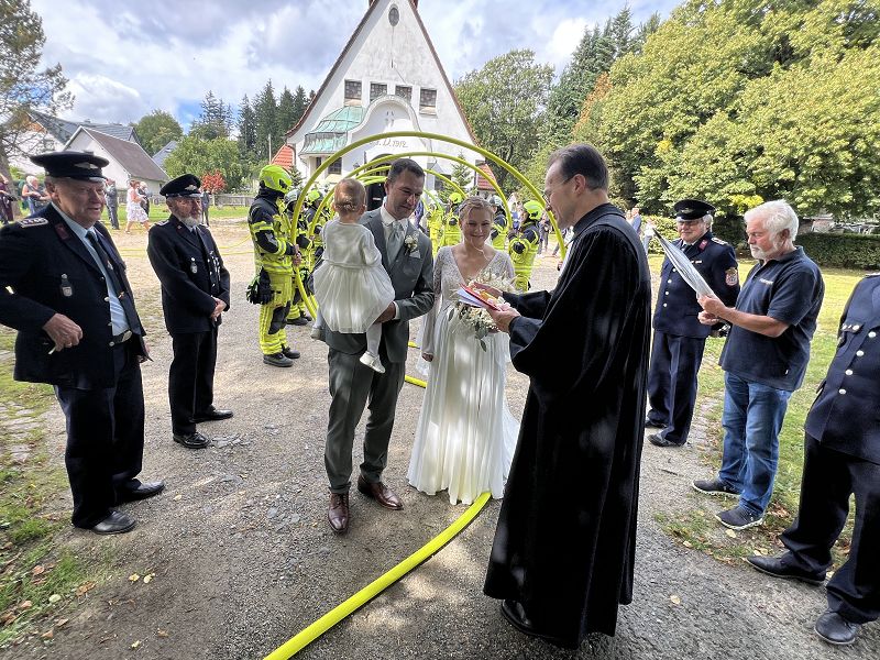 Als sich dann die Kirchentüren öffneten, haben die frisch Vermählten die Glückwünsche der stellvertretenden Wehrleiter Daniel Kern und Tiemo Pöhler entgegennehmen dürfen. Erst dann kreuzten sich zwei Wasserstrahlen zu einem Wassernebel, den Alicja und Michael mit ihrer Tochter durchlaufen mussten.