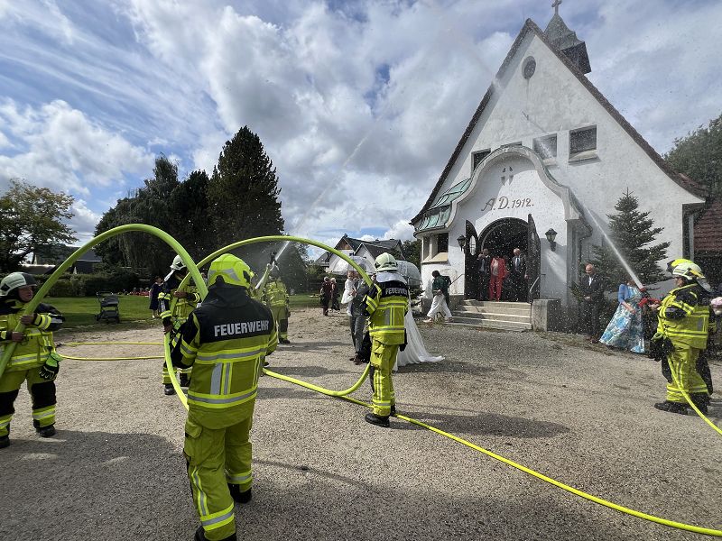 Drum machten sich fast 20 Feuerwehrfrauen und Feuerwehrmänner auf zur Grünbacher Kirche und bauten Schläuche und Strahlrohre auf, um genau das vorzubereiten, was seit vielen Jahren die Grünbacher Brautpaare erleben und genießen dürfen.