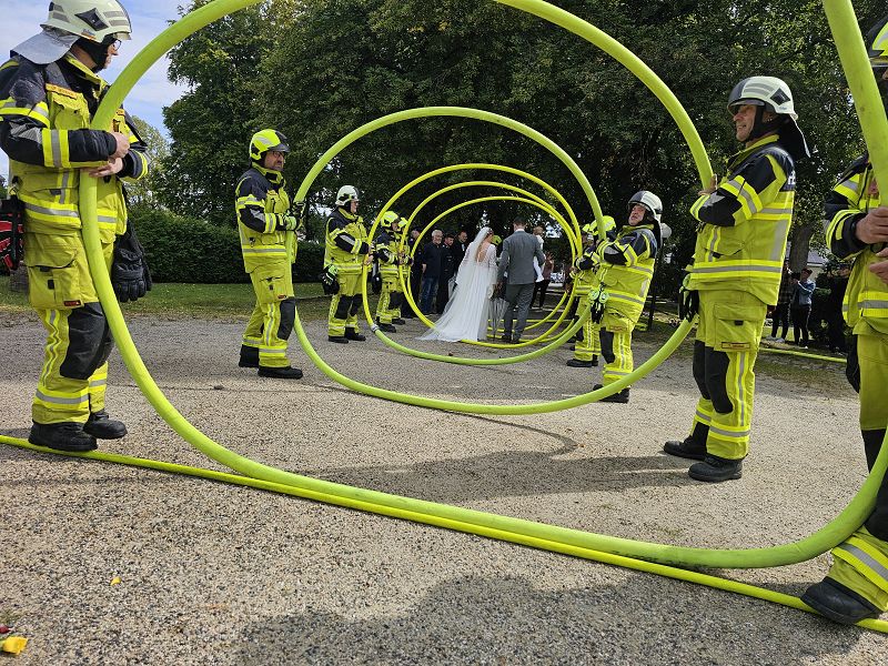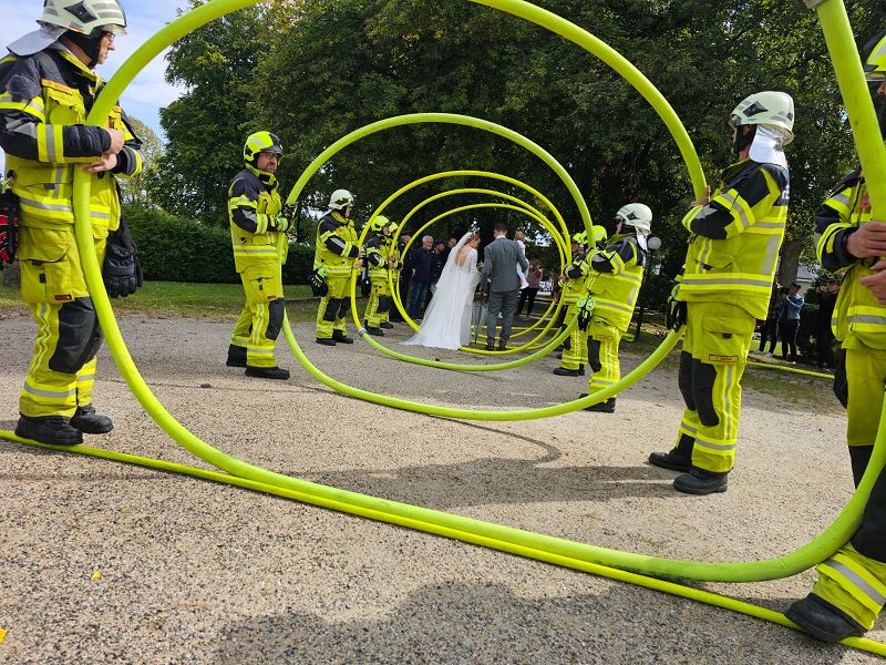 Im Anschluss ging es durch die Schlauchringe, um den Bund zwischen dem Paar und der Feuerwehr zu dokumentieren, ehe am Schluss das Abschlussfoto wartete.