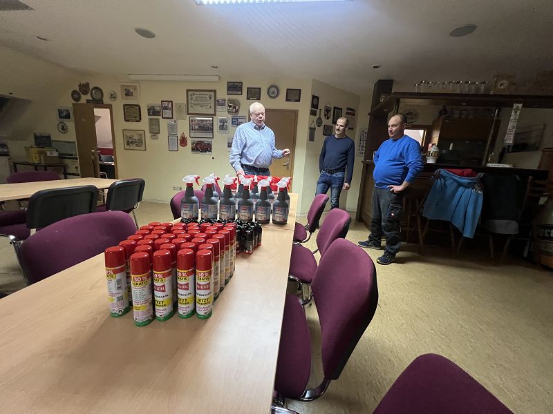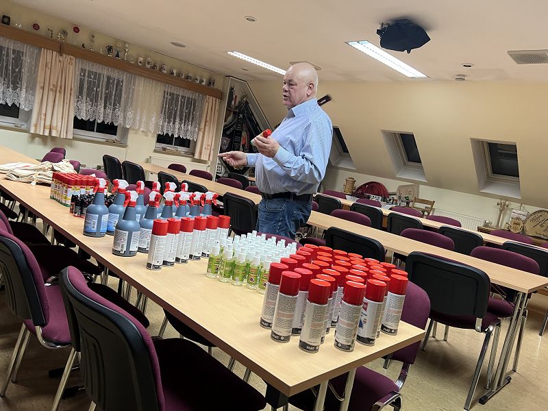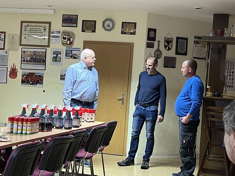 Bernd Jakob war es deshalb eine Herzenssache der Grünbacher Feuerwehr ein umfangreiches Schmier- und Pflegeset für die Pflege der Fahrzeuge zu erläutern und vollständig zu spenden. Die beiden stellvertretende Wehrleiter Tiemo Pöhler und Daniel Kern bedanken sich bei Bernd Jakob auf das herzlichste. Das Autohaus ist auch über das gesamte Jahr stets unterstützend, der Feuerwehr gegenüber unterwegs. Dafür möchten auch wir der Familie Jakob und deren Mitarbeiter unseren Dank aussprechen.