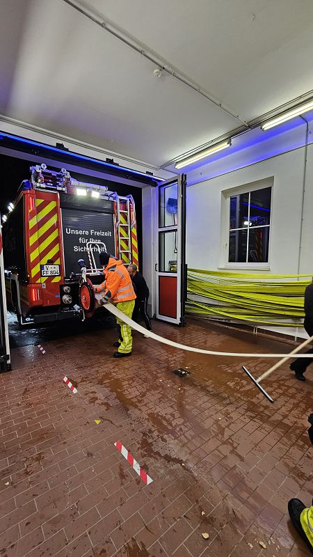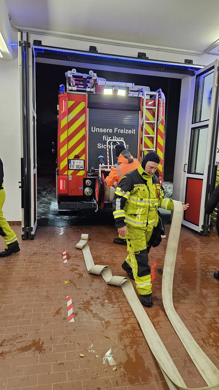 Die Einsatzkräfte benötigten nur einen sehr kurzen Wassereinsatz, dann hatten sie alles im Griff. Nach der umfangreichen Beräumung im Gebäudebereich galt es die Einsatzmittel zu Hause im Feuerwehrhaus angekommen, zu reinigen.