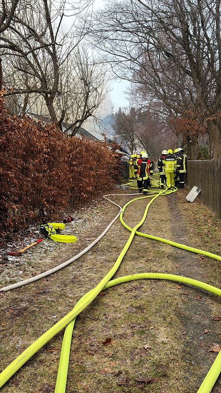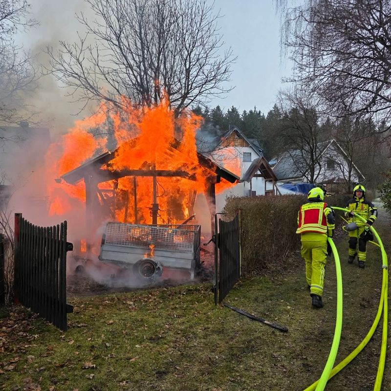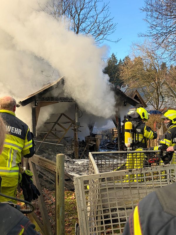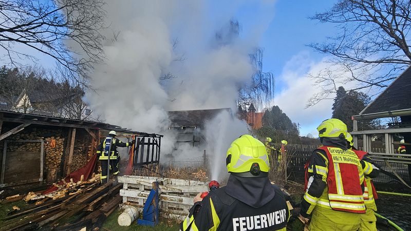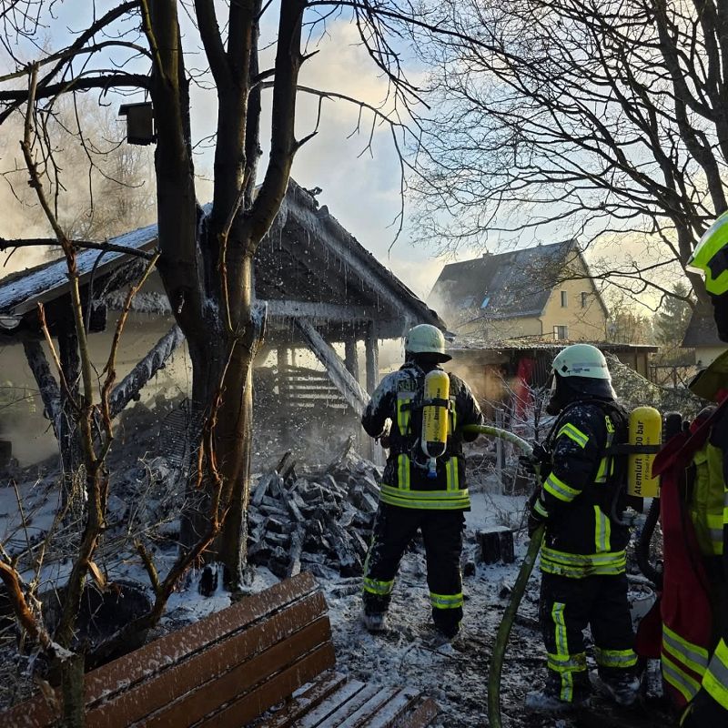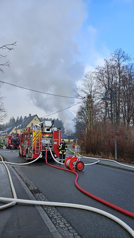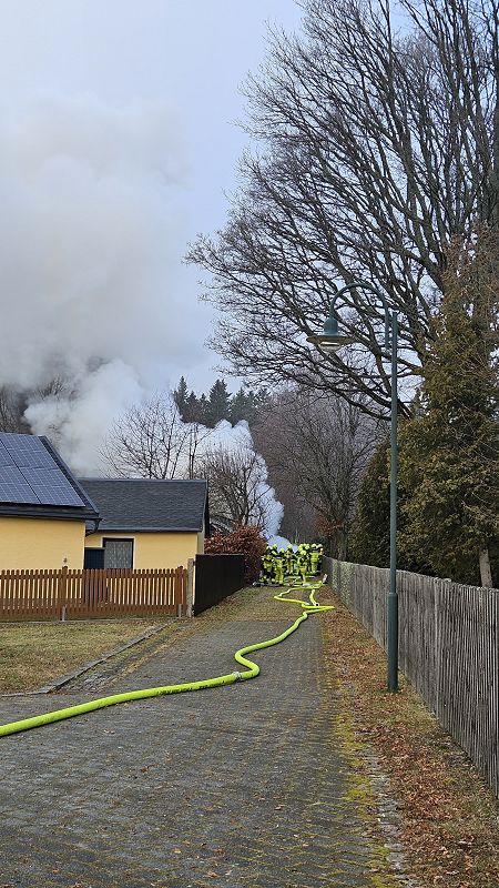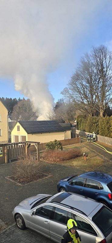 Am ersten Tag nach den Weihnachtsfeiertagen heulten die Sirenen in Grünbach, Muldenberg und Falkenstein. Es sollte am Schönecker Weg brennen. Schon bei der Anfahrt der ersten Grünbacher Einsatzkräfte war klar, es brannte und sogar sehr heftig. Rauchschwaden zogen über die Straße zum Wendelstein. Unmittelbar am Friedhof brannte ein Nebengebäude hinter den dortigen Wohnhäusern lichterloh! Ein Schuppen diente der Lagerung von Brennholz und brannte im Vollbrand. Da war nichts mehr zu retten und deshalb war den Einsatzkräften schnell bewusst, es galt alle Häuser im Umfeld des brennenden Schuppens zu schützen! Riegelstellung heißt diese Einsatztaktik bei den Feuerwehrleuten- und die wurde mit Strahlrohren hervoragend umgesetzt. Kein anderes Nebengebäude, oder gar ein Wohnhaus wurden in Mitleidenschaft gezogen und es gab auch keinen Personenschaden. Das lag auch daran, dass kaum Wind aufkam, der die Flammen hätte auf die Gebäude lenken können.