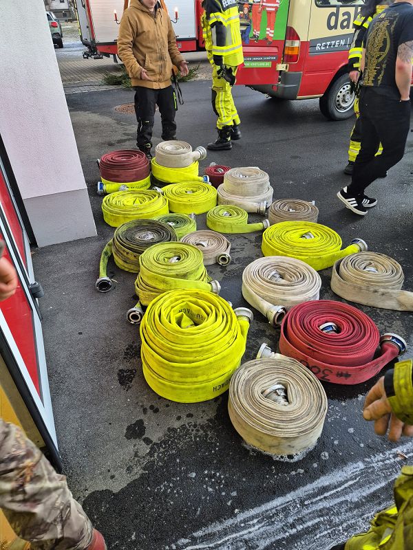 Noch am selben Tag wurden die Schläuche gereinigt, die schmutzige Einsatzkleidung in das feuerwehrtechnische Zentrum nach Eich zur Reinigung gebracht und auch neue Atemschutzgeräte wurden leihweise auf den Einsatzfahrzeugen verlastet, bis unsere eigenen wieder gereinigt und gefüllt in Grünbach ankommen.