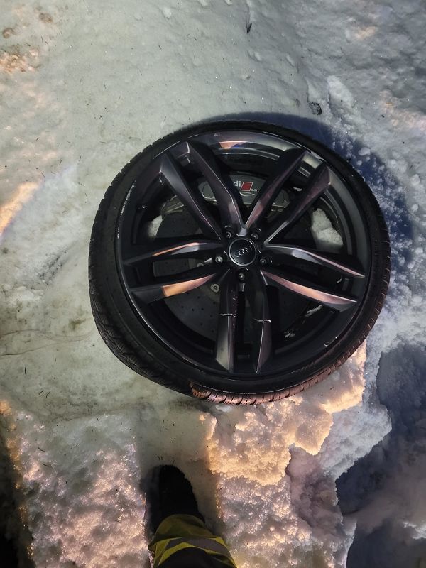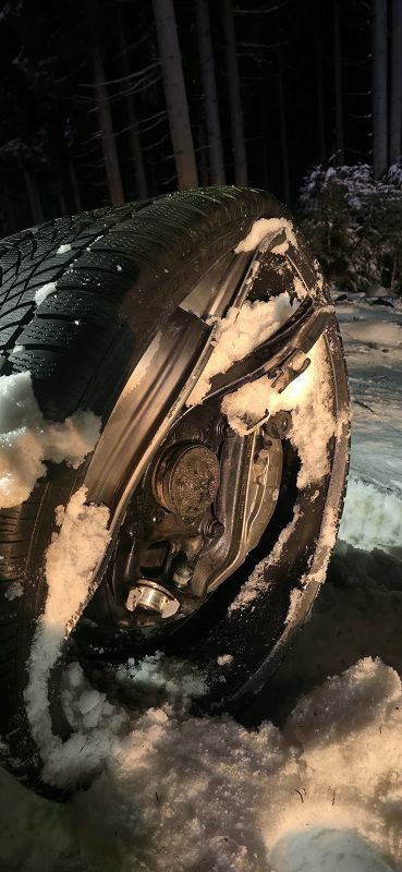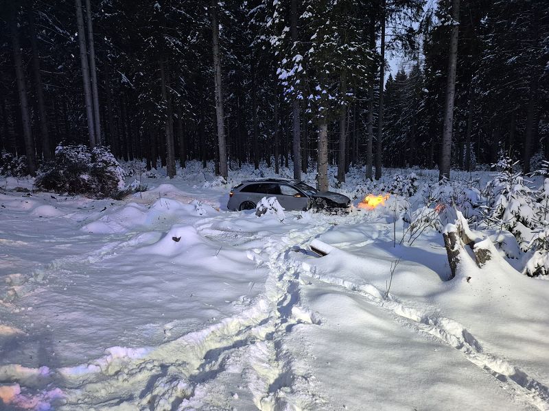 Auf Grund der hohen Geschwindigkeit des Überholenden Audi, raste dieser in den Wald und riss sich dabei die Vorderachse seines Fahrzeuges ab. Wie durch ein Wunder kam es zu keiner Kollision mit den Bäumen, durch die das Fahrzeug seinen Weg nahm.