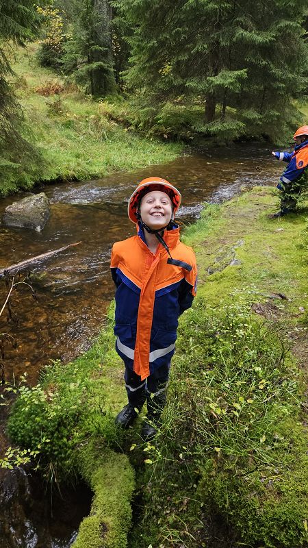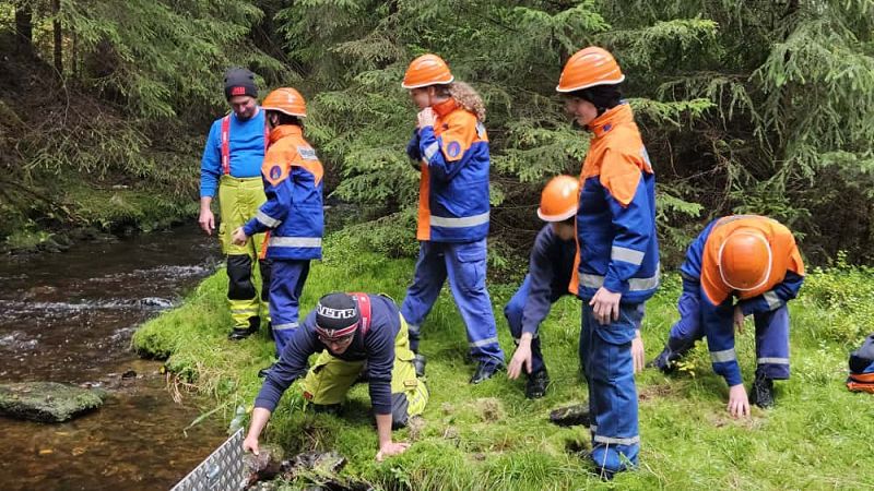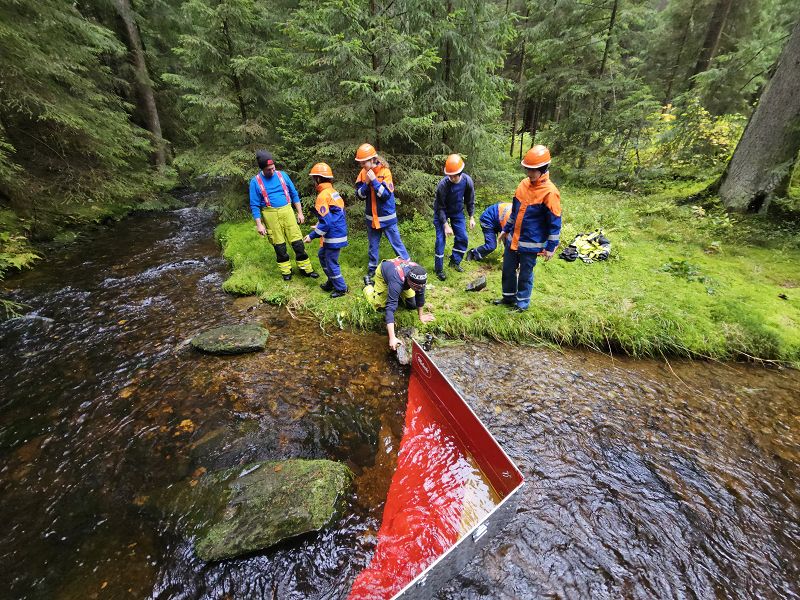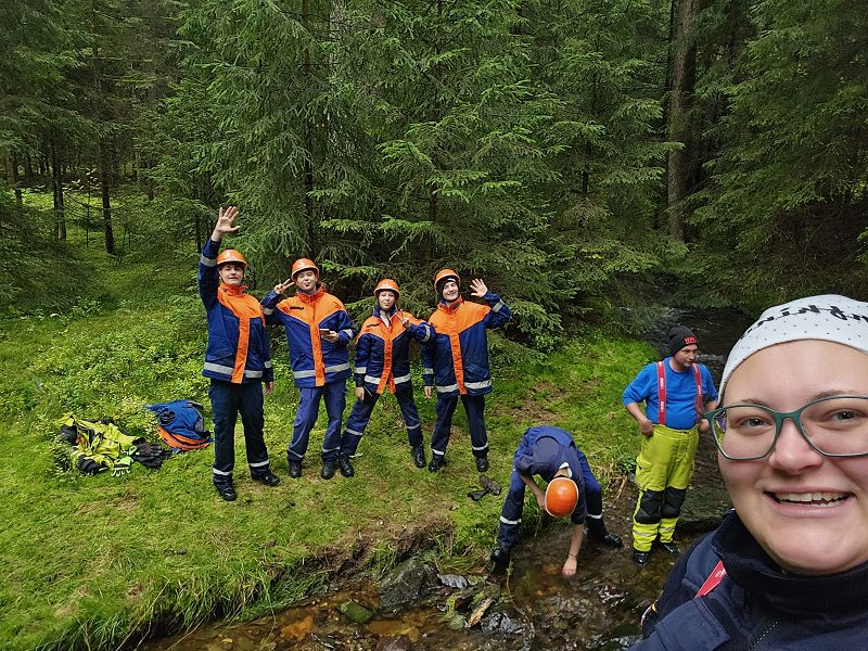 Nach unserer Mittagspause fuhren wir mit den Feuerwehrautos ins Göltzschtal und bauten unseren Biber auf, eine mobile Staustelle. Dieses Gerät ermöglicht es uns, bei niedrigem Bachwasser, immer noch genügend Wasser für eine Löschwasserentnahme anstauen zu können.