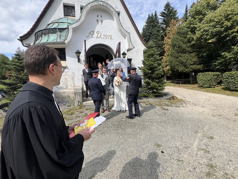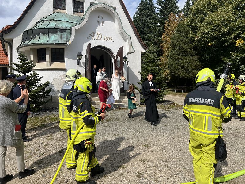 Verheiratet waren die beiden Einsatzkräfte schon zwei Jahre, nun schlossen unser Gemeindewehrleiter Michael Breitfeld mit seiner Alicja auch den kirchlichen Bund fürs Leben. Anlass für die Feuerwehrleute der Grünbacher Feuerwehr, mit dem frisch vermählten Brautpaar die Feuerwehrtaufe durchzuführen.