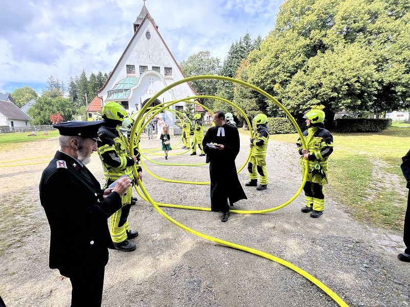 Drum machten sich fast 20 Feuerwehrfrauen und Feuerwehrmänner auf zur Grünbacher Kirche und bauten Schläuche und Strahlrohre auf, um genau das vorzubereiten, was seit vielen Jahren die Grünbacher Brautpaare erleben und genießen dürfen.