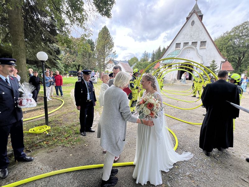 Als sich dann die Kirchentüren öffneten, haben die frisch Vermählten die Glückwünsche der stellvertretenden Wehrleiter Daniel Kern und Tiemo Pöhler entgegennehmen dürfen. Erst dann kreuzten sich zwei Wasserstrahlen zu einem Wassernebel, den Alicja und Michael mit ihrer Tochter durchlaufen mussten.