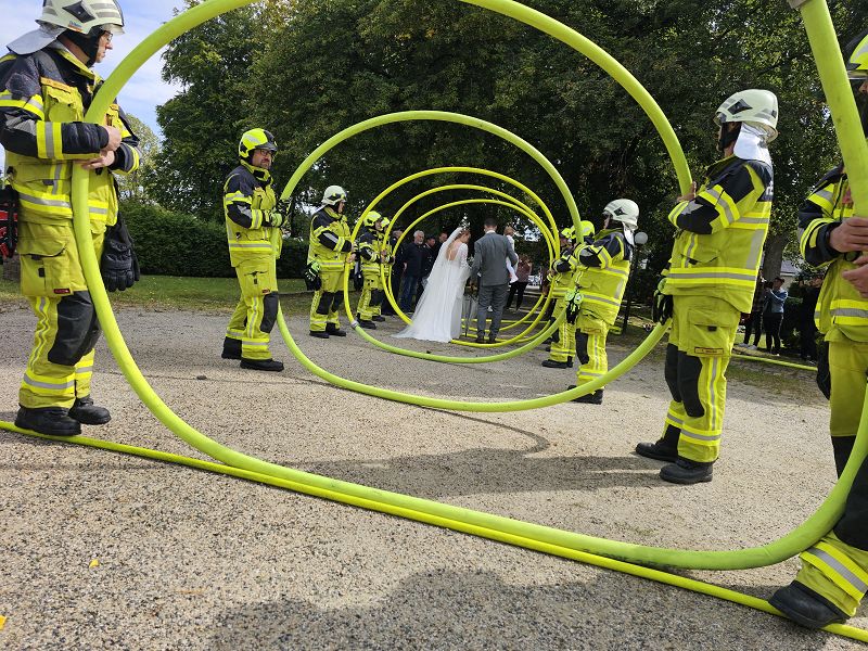 Im Anschluss ging es durch die Schlauchringe, um den Bund zwischen dem Paar und der Feuerwehr zu dokumentieren, ehe am Schluss das Abschlussfoto wartete.